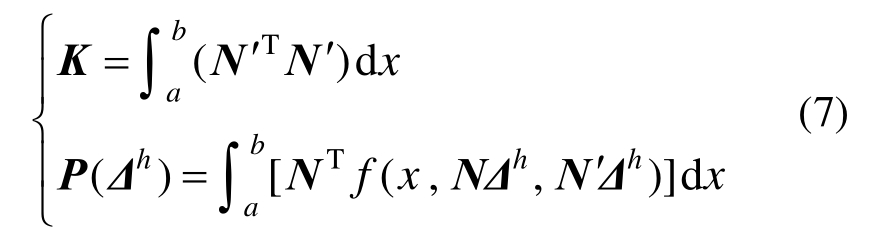 将试探函数与检验函数代入弱形式可得有限元刚度矩阵K和荷载向量P(Δh):