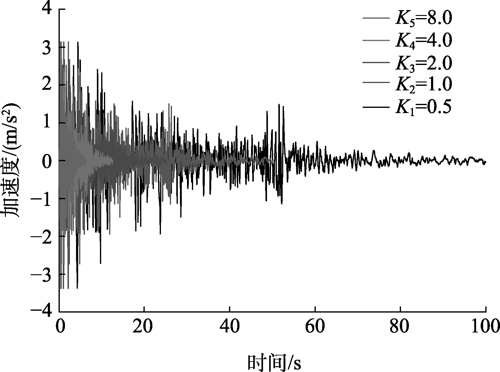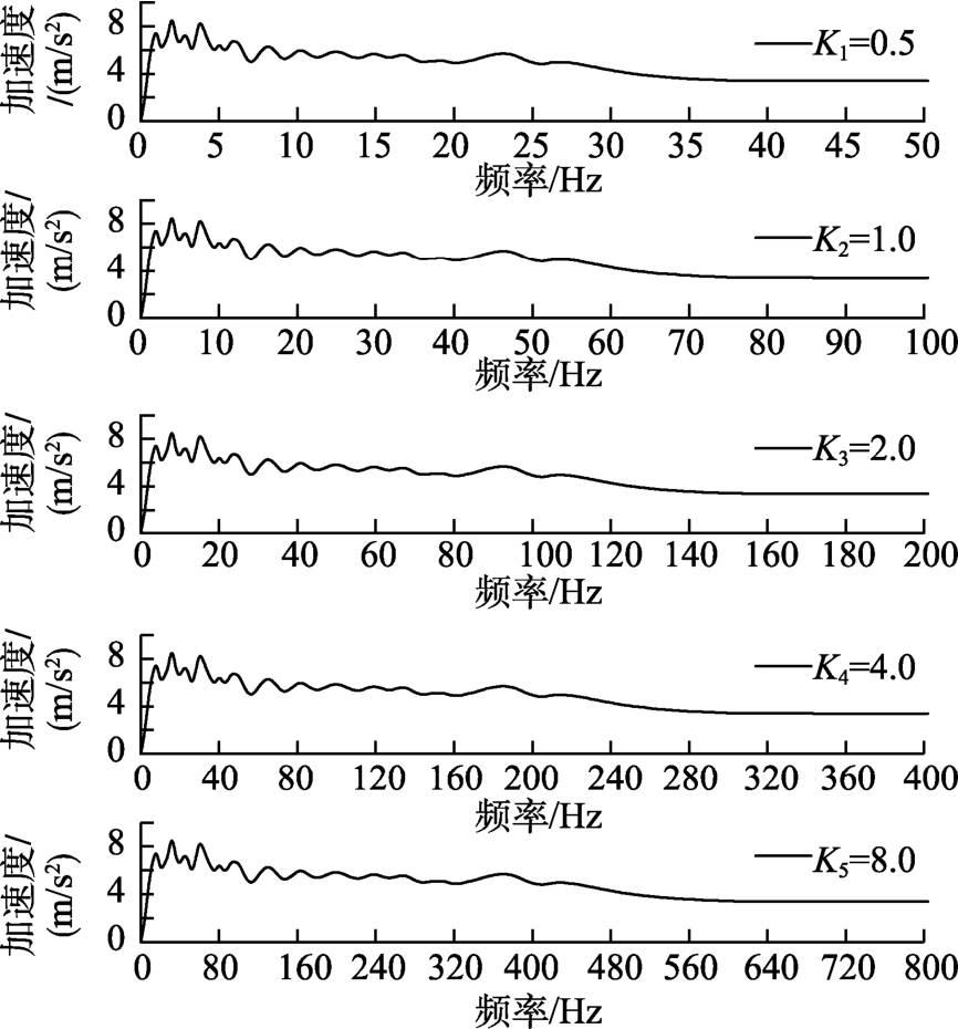 由图3可知,5种不同时间压缩的ELCentro波的峰值加速度平台均约为7.0 m/s2。当K1=0.5时,ELCentro波的卓越频率峰值平台Smax对应的频率范围约为1.0 Hz~4.0 Hz;K2=1.0时,约为2.0 Hz~8.5 Hz;K3=2.0时,约为4.0 Hz~17.0 Hz;K4=4.0时,约为8.0 Hz~34.0 Hz;K5=8.0时,约为16.0 Hz~68.0 Hz。可见,Ki每增加一倍,ELCentro波的卓越频率峰值平台Smax对应的起始频率以及频率范围也相应的增加一倍,二者具有较好的线性增长关系。