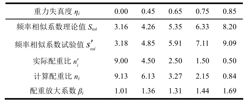 重力失真度ηi 0.00 0.45 0.65 0.750.85频率相似系数理论值Sωi 3.16 4.26 5.35 6.338.20频率相似系数试验值sω′i 3.18 4.85 5.91 7.119.09实际配重比ni ′ 9.00 4.50 2.50 1.500.50计算配重比ni 9.13 6.13 3.27 2.150.84配重放大系数βi 1.01 1.36 1.31 1.441.69