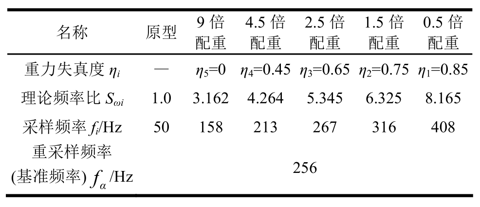 表3以重力失真度为0.85的(0.5倍配重)模型为例,给出了输入频率比Ki的变化。根据频率比及式(4)计算可得到重采样频率fri,计算结果如表3第4行所示,即需要输入5种不同重采样频率的地震波。