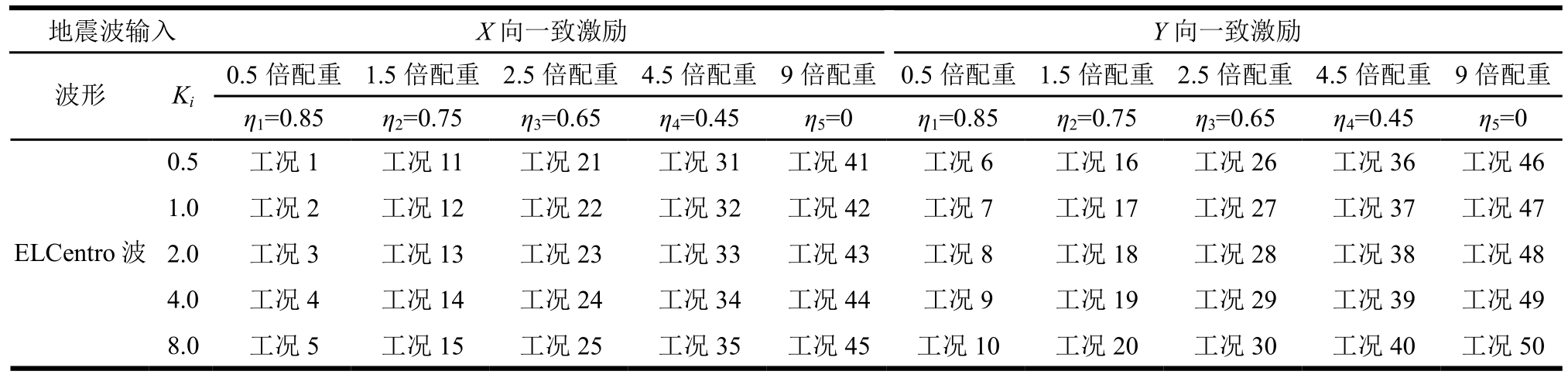 地震波输入 X向一致激励Y向一致激励波形 Ki η=0.85 η=0.75 η=0.65 η=0.45 η=0 η=0.85 η=0.75 η=0.65 η=0.45 η=0 1234512345 0.5倍配重 1.5倍配重 2.5倍配重 4.5倍配重9倍配重0.5倍配重1.5倍配重2.5倍配重 4.5倍配重9倍配重0.5 工况1 工况11 工况21 工况31工况41工况6 工况16工况26 工况36工况46 ELCentro波1.0 工况2 工况12 工况22 工况32工况42工况7 工况17工况27 工况37工况47 2.0 工况3 工况13 工况23 工况33工况43工况8 工况18工况28 工况38工况48 4.0 工况4 工况14 工况24 工况34工况44工况9 工况19工况29 工况39工况49 8.0 工况5 工况15 工况25 工况35工况45工况10工况20工况30 工况40工况50