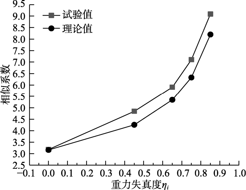 由图4可知,随着重力失真度的增加,模型第一阶固有频率及其相似系数也增加;同时,试验实测频率相似系数要大于理论相似系数,即失真模型的刚度更大。不过,随着重力失真度的减小,二者误差逐渐减小,满配重时,模型与原型第一阶固有频率表现出较好的相似性。因此,比较可知,重力失真对拱结构模型第一阶频率相似有较大的影响,配重不足时,由试验结果反推原型存在一定的误差,误差最大超过20%,重力失真的影响不可忽略。