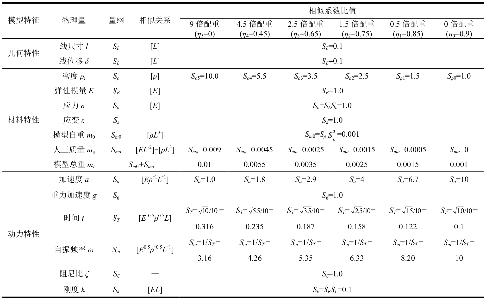 Sρi计算结果如表1第3行所示,分别为10.0、5.5、3.5、2.5和1.5,也即需设置9倍配重、4.5倍配重、2.5倍配重、1.5倍配重和0.5倍配重,如表1所示。表1也给出了该模型其它物理相似系数的关系式和比值,同时也给出了0倍配重(无配重,也即忽略重力模型)时的比值。