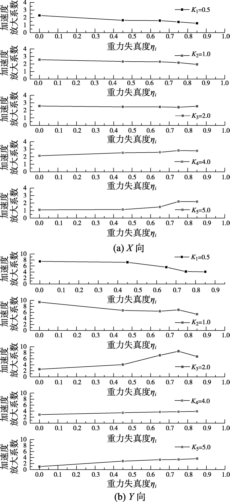 由图7(a)可知,当频率比为K1=0.5和K2=1.0时,X向加速度放大系数随着失真度的增加而减小。频率比K3=2.0时,重力失真度的影响不明显,X向加速度放大系数基本相同,约放大2.5倍。当频率比K4=4.0和K5=8.0时,X向加速度放大系数随着重力失真度的增加呈现增大的趋势。这是因为重力失真越小的模型,基频也越小,激振频率越高、相应响应也越小。