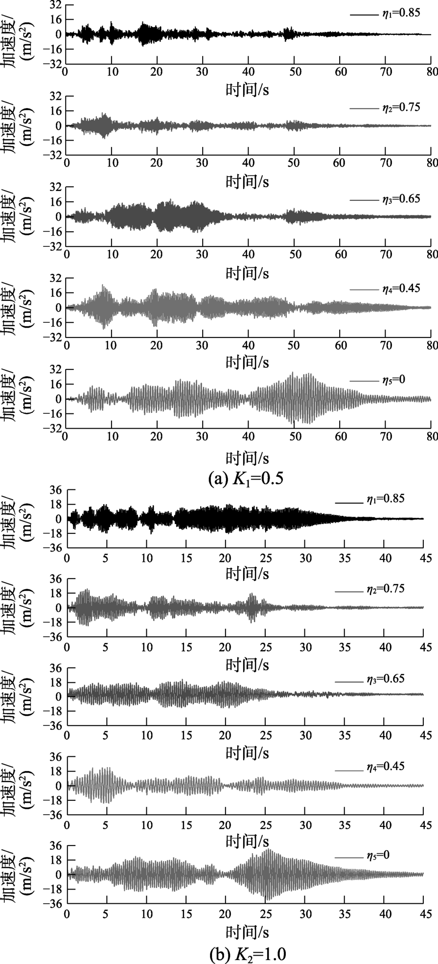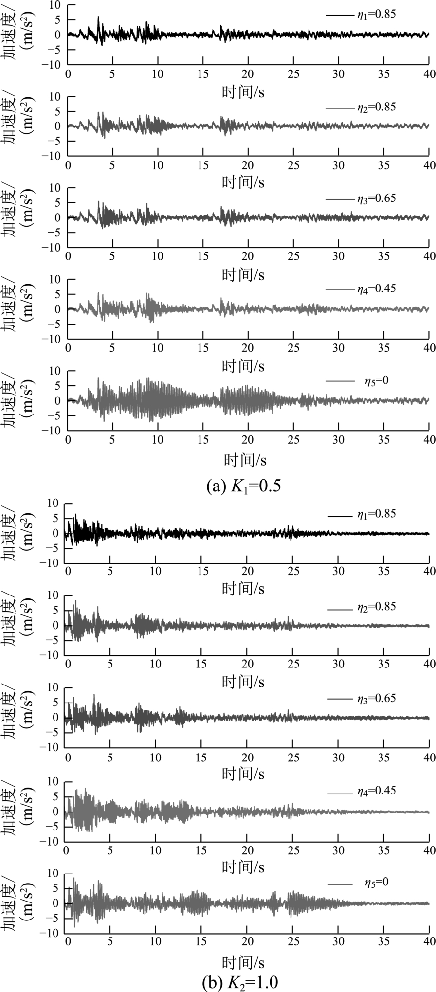 由图5可知,频率比K1=0.5和K2=1.0时,不同重力失真度ηi的拱结构模型X向加速度时程具有较明显的不同,重力失真度越小、加速度时程越饱满,模型拱动力响应也越大,加速度峰值出现的时间也延后越明显。另外,满配重(无重力失真,η=0)时的加速度响应明显大于其它失真模型的加速度响应。
