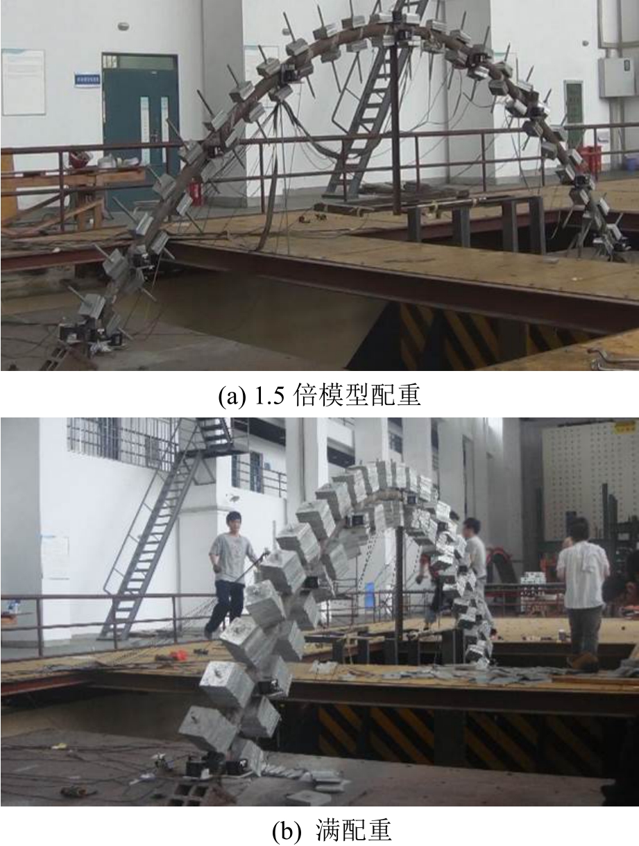 钢管混凝土拱结构试验模型按几何缩尺比例1∶10设计制作,模型净跨径L为4.6 m,净矢高f为1.53 m,矢跨比ϑ(ϑ=f/L)为1/3,拱轴线为二次抛物线。通过沿模型拱轴线方向每隔20 cm焊设与之垂直的长度为48 cm的钢杆来固定配重,并通过施加不同的配重块来实现不同的欠人工质量模型,以实现不同的重力失真度。人工质量的设置如图1所示,其中,图1(a)是1.5倍模型配重时的照片,图1(b)是满配重时的照片,为了节省篇幅,其它配重模型照片未给出。为了使模型固定在振动台台面上,加工制作了2块长宽为1.0 m×1.0 m、厚为35 mm的固定铁板,使该模型的两拱脚通过设置三角撑焊接在铁板上,再在铁板上开螺孔,然后通过高强螺栓连接使铁板锚固于振动台台面上。