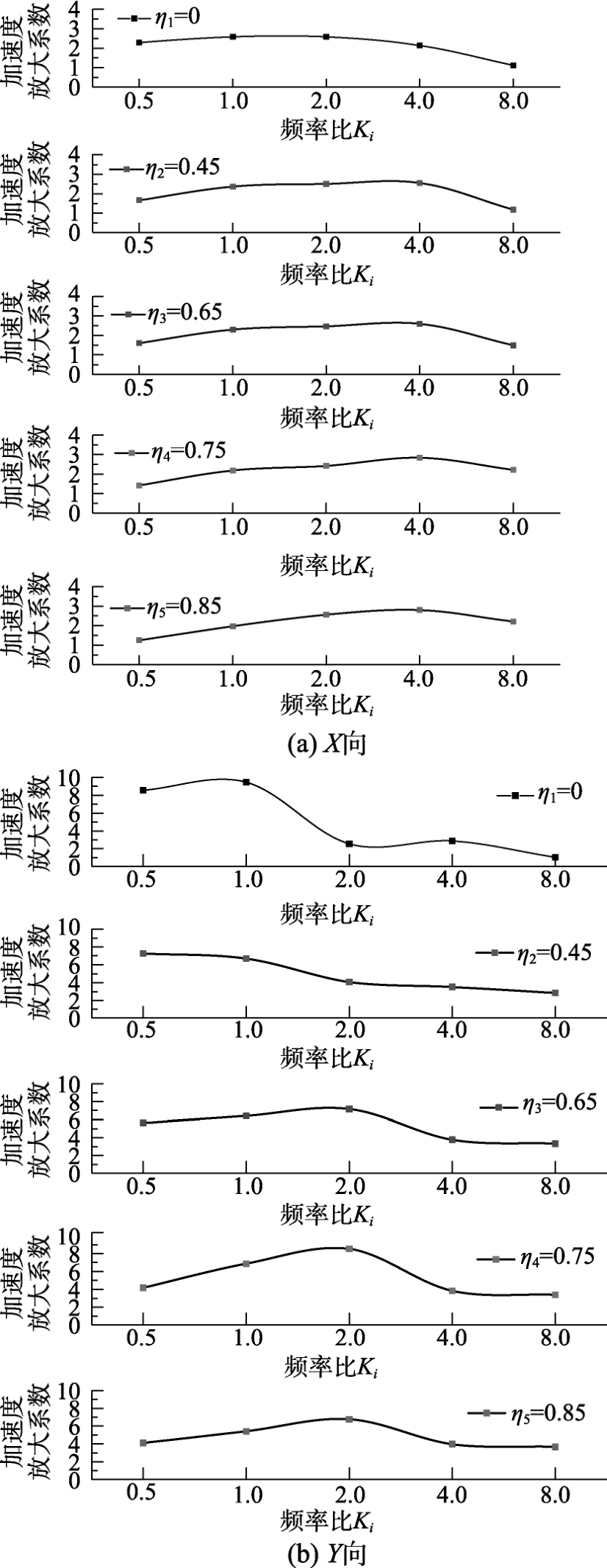 为了分析时间压缩对不同失真度模型加速度响应的影响,图8给出了模型X向和Y向加速度响放大系数与频率比的关系曲线,其中X向激励时,给出的是L/4截面处的,Y向激励时,给出的是L/2截面处的。由图8(a)可知,对于不同失真度的拱结构模型,随着激励波频率比的增加,其X向加速度放大系数基本呈现先增加后减小的趋势。失真度较小的模型(η1=0和η2=0.45)基本以频率比K2=1.0和K3=2.0时的加速度放大系数最大、频率比K5=8.0时的加速度放大系数最小。失真度较大的模型基本以频率比K4=4.0时的加速度放大系数最大、频率比K1=0.5时的加速度放大系数最小。