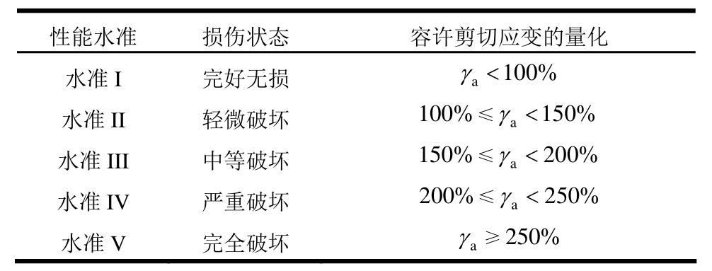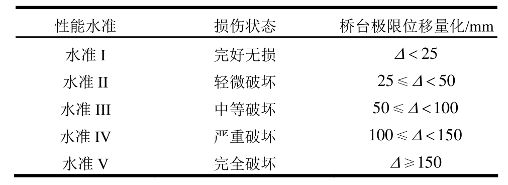 既往对桥台损伤状态的研究较少,Nielson[5]、Ahmed等[12]和HAZUS[16]多以桥台的相对位移作为其损伤指标,通过相应的定量描述来判断其抗震性能水准等级。因此,本文同样选取相对位移值作为损伤指标,并且将其划分为五等级抗震性能水准,参考 HAZUS[16]提出的划分方法定义桥台极限状态如表3所示。