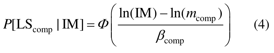 基于前述IDA计算结果,可以计算得到不同地震动强度IMj(j= 1,2,3,… ,n)下构件发生损伤状态概率的离散数据点P[LSc omp|IMj]。假设构件的易损性曲线为对数正态分布函数,如下式所示: