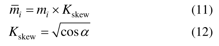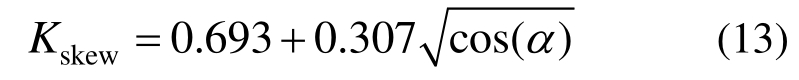 从前述分析可知,斜交角度对地震易损性参数的影响规律随角度增大而愈加明显。2006年美国FHWA发布的《公路结构抗震修复手册》及 2009年台湾地震工程研究中心报告 NCREE-09-028《公路桥梁耐震能力评估及补强准则之研究》中都提出斜交因素可以通过一个斜交角度修正系数进行调整[18,29],即在正交梁桥地震易损性基准中位值的基础上乘以该修正系数,如式(11)所示,而斜交角度修正系数Kskew则如式(12)所示。
