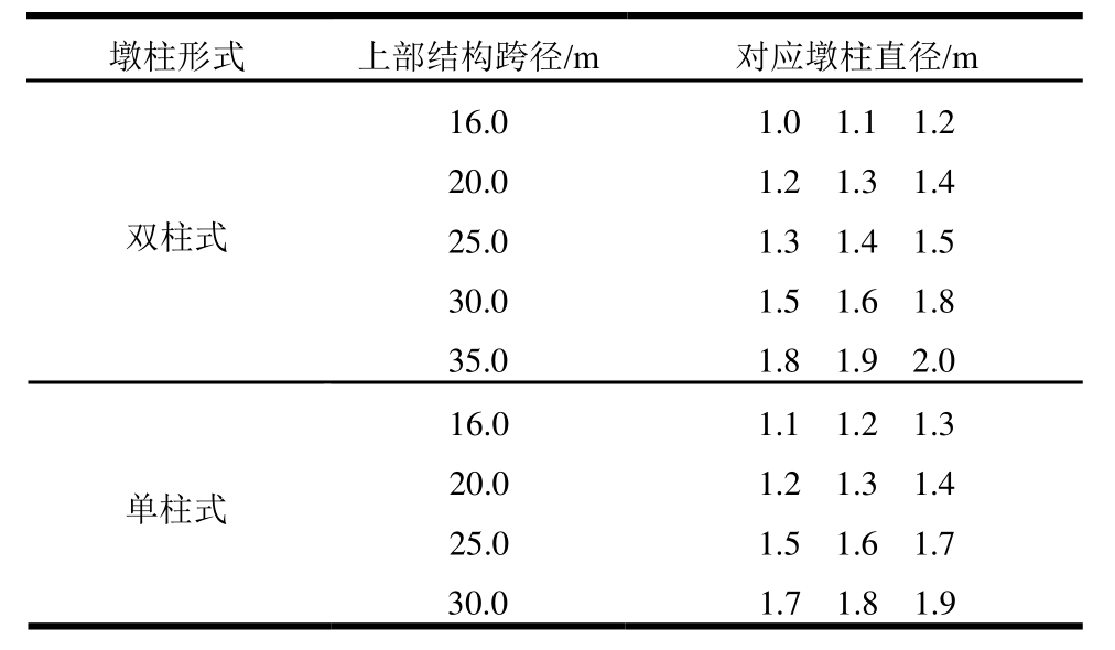 本文墩柱采用圆形截面。从已有的桥梁数据来看,墩柱截面直径的变化范围较大,小到不足1 m,大到超过 3 m。通过对实际桥梁工程的调查统计,本文发现公路斜交梁桥的墩柱截面与跨径存在一定的关系:上部结构总质量及墩柱截面将随着跨径增大而增大,并且与墩柱形式、上部结构形式有一定联系。综合考虑以上因素后,本文根据实际桥梁工程中的数据统计,每种跨径选取常见的3种墩柱直径,通过均匀抽样随机分配在6种上部结构中。所选用墩柱直径与上部结构跨径的对应关系如表 6所示。