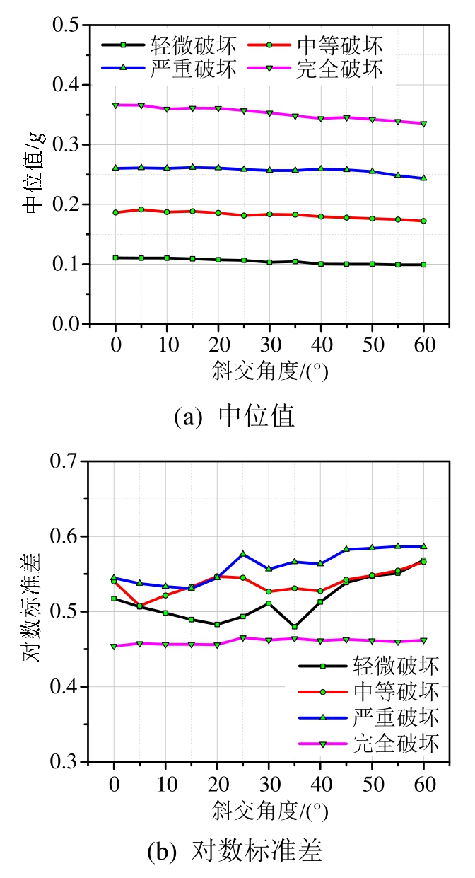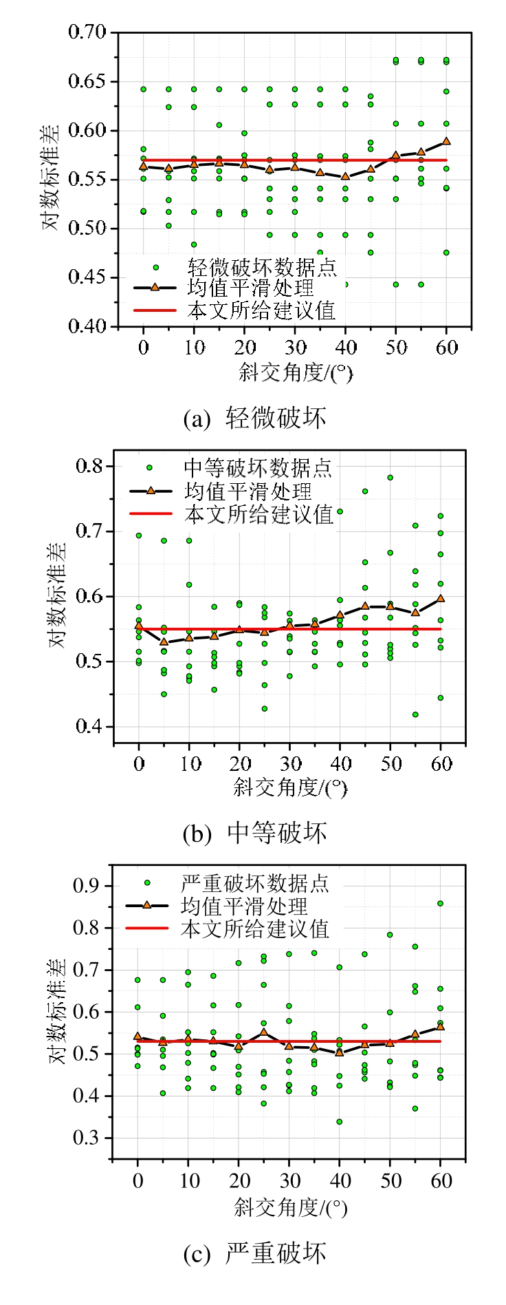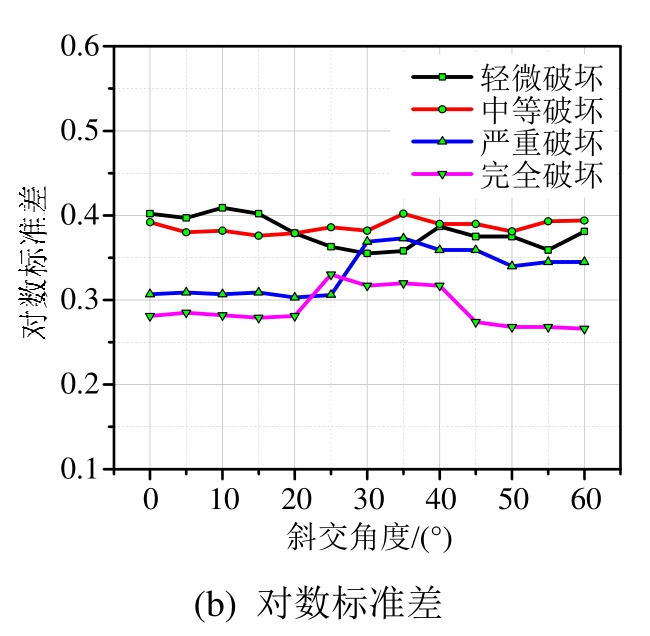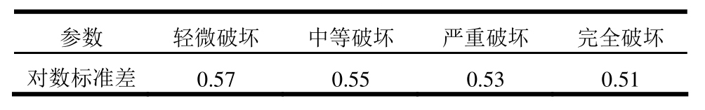 从图 11可以看出,对数标准差的基本规律与3.1.1节得出的结论相符:轻微破坏的对数标准差值最大,中等破坏次之,严重破坏再次,完全破坏最小。由于对数标准差仅体现数据的离散程度,并无相应的工程物理意义且数据较为散乱,因此本文建议针对每一损伤状态对其取均值,具体数值如表10所示。