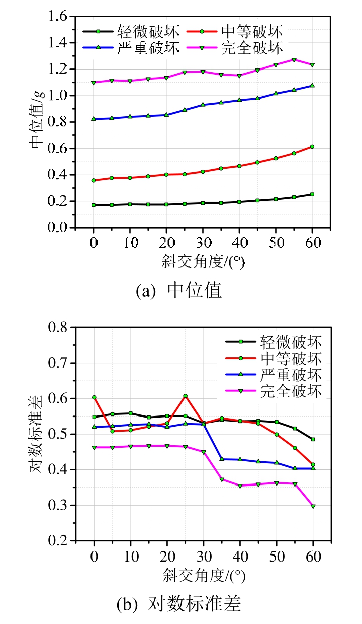 系统地震易损性地震易损性参数变化如图9所示。从整体上看,系统破坏的中位值大致随角度的增大呈下降趋势,其中完全破坏下降幅度最为显著,说明桥梁随角度的增加变得更加易损。在0°~30°范围内,中位值大致呈小幅度波动式下降;在 30°~60°范围内,各损伤状态中位值下降幅度较为明显。在对数标准差方面,部分数据点有较为异常可能是由于对数标准差本身的离散型较大,需要更多地震波及计算数据才能得到相对稳定的数据。但大致仍可看出一定变化趋势:对数标准差随角度的增大呈波动式上升趋势,并且大致保持了构件对数标准差的的统一规律:轻微破坏的对数标准差最大,完全破坏最小,中等破坏及严重破坏数值较为接近。