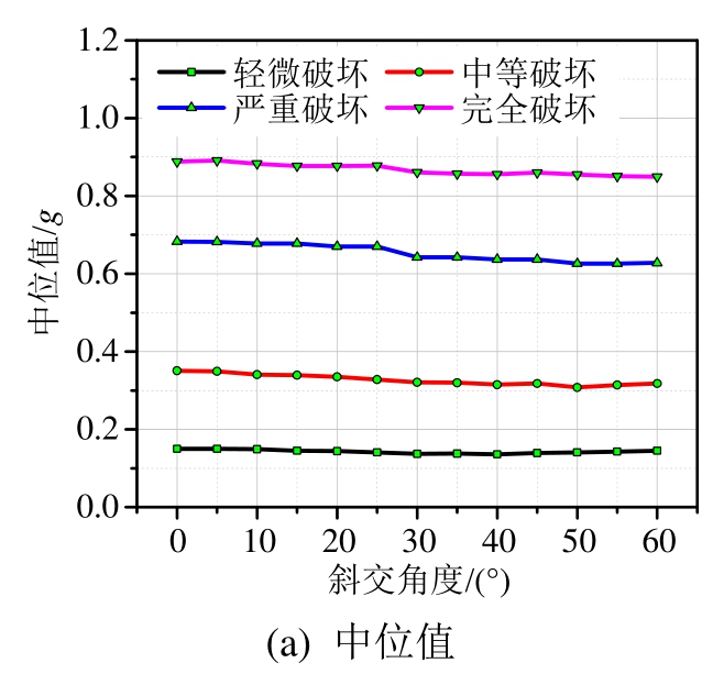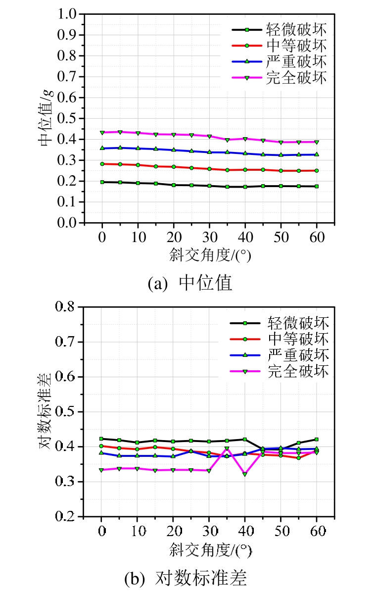 从上述3个易损构件纵向及横向的地震易损性参数变化可以看出:大部分构件的中位值随斜交角度的增加而减小,也更加易损。而对数标准差基本维持统一规律:轻微破坏的对数标准差最大,完全破坏最小,中等破坏及严重破坏数值较为接近。