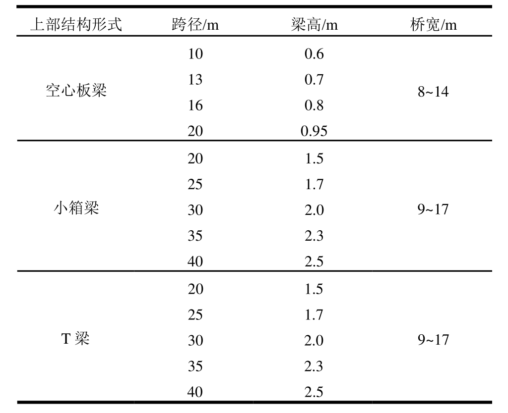 我国公路斜交梁桥常用的上部结构主要有空心板、T梁和箱梁三种形式。查阅公路桥梁上部结构通用图,可以得到这三种形式上部结构的基本参数分布情况如表5所示。