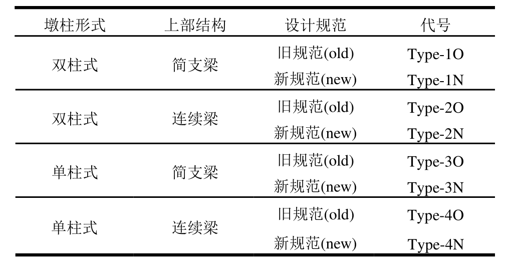 本文的研究对象是整个大类公路斜交梁桥的地震易损性,为了确保包含各类形式桥梁样本,使其更具有代表性,本文首先从桥梁上部结构的支承形式、常用的墩柱形式的角度对公路斜交梁桥进行分类考虑,同时考虑到《公路桥梁抗震设计细则》(JTG/T B02-01-2008)颁布之后[22],桥梁设计更加完善,桥梁抗震性能得以提高,因此本文根据使用2008年前后不同的抗震设计规范,将桥梁样本也分为按旧规范设计以及按新规范设计的两类。综上所述,具体公路斜交梁桥样本分类如表4所示。