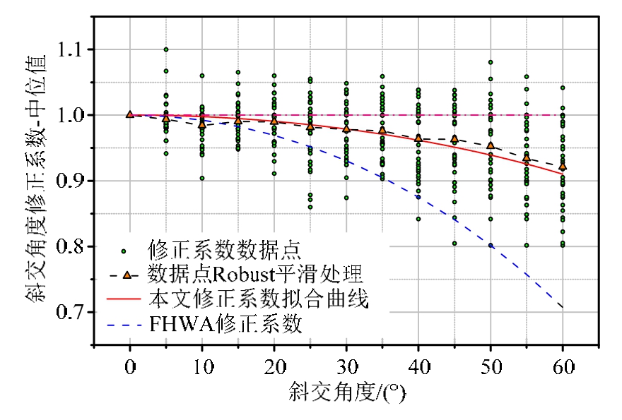 根据每个角度含有8类桥型,各类桥型4个损伤状态中位值,共计 32个数据点作为拟合中位值修正系数Kskew样本点。将这些数据点与正交梁桥的数据做比值,并画出这些离散数据点如图 10所示。采用MATLAB对数据点进行Robust平滑处理,从图中可以看出:0°~60°范围内,中位值修正系数大致呈波动性弧度下降趋势。因此本文认为该公式不需要分段,运用Levenberg-Marquardt算法对其进行非线性稳健拟合,得出公式如下所示,拟合曲线如图10所示。