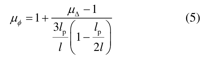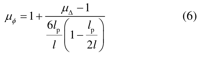 双柱式桥墩分垂直斜度及平行斜度两个方向,而墩柱在水平地震作用下垂直斜度方向与独柱式桥墩破坏形式相同,因此两者同时服从位移延性比μΔ与曲率延性比φμ的变换公式,而平行斜度方向的变化公式如下式: