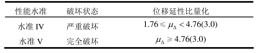 在进行桥梁结构的地震易损性分析时,不仅需要定义结构的抗震性能水准,还需要对构件的不同等级的抗震性能水准提出相应的量化指标,即对构件各损伤极限状态值作出定量描述。既往桥梁结构地震易损性分析研究中较多学者采用以位移延性比作为墩柱的损伤指标,其中最具代表性的是Hwang等[17]提出的五级抗震性能水准划分,将各损伤极限状态定性描述为:按钢筋屈服、混凝土开裂、混凝土剥落及钢筋屈曲四种,并依次定义为轻微破坏、中等破坏、严重破坏以及完全破坏,对应的极限状态值分别为 1.0、1.2、1.76、4.76。而后,FHWA[18]在其《公路结构抗震修复手册》中针对墩柱提出了修正建议,认为对于一些周围约束比较弱的墩柱,完全破坏状态对应的位移延性比应取为3.0。
