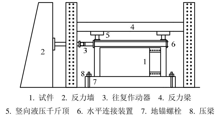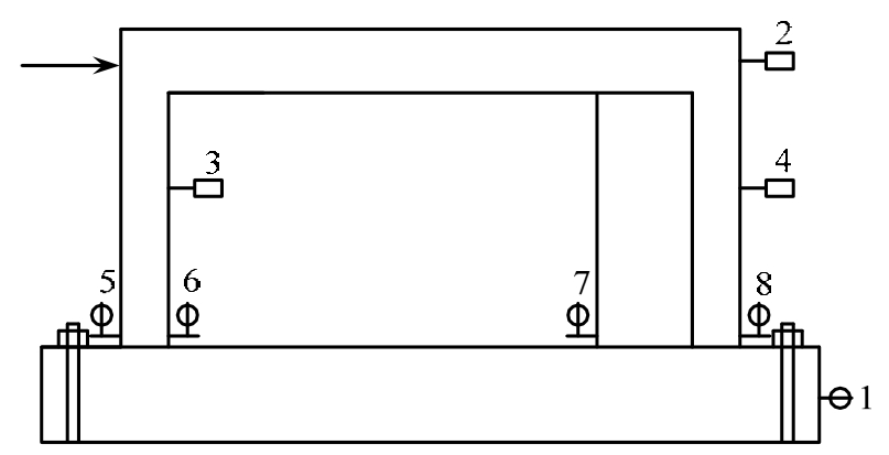 在底梁端部安装百分表 1,以测试试件的整体水平滑移;在顶梁非加载一侧布置位移计 2,用于测试结构整体水平位移;在两框架柱1/2高度处分别安装一个位移计(位移计3、位移计4),测试该处的水平位移;在框架柱的柱脚两边各布置一个竖向位移计(位移计 5~位移计 8),用以测试柱对应点处的竖向位移。位移计布置如图5所示。