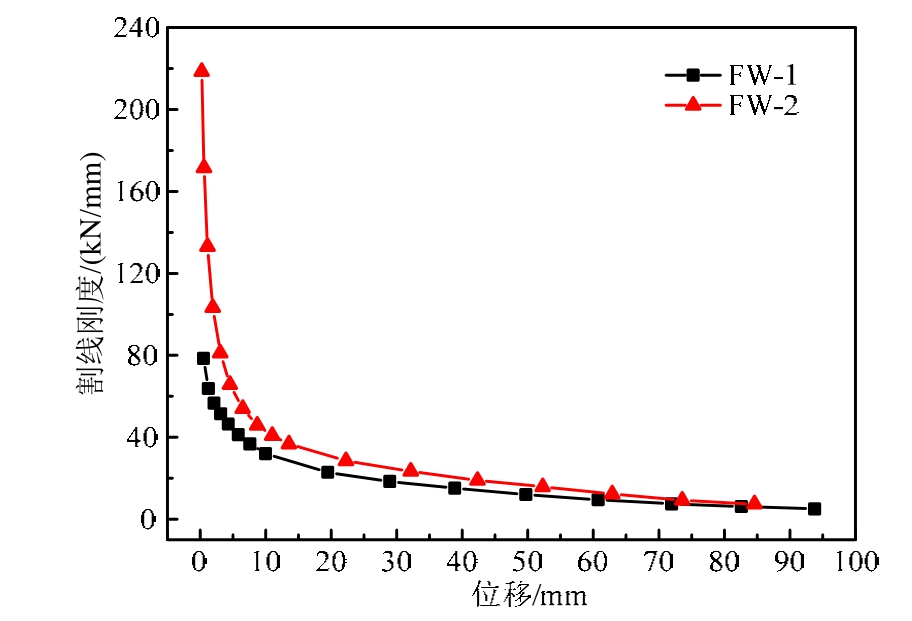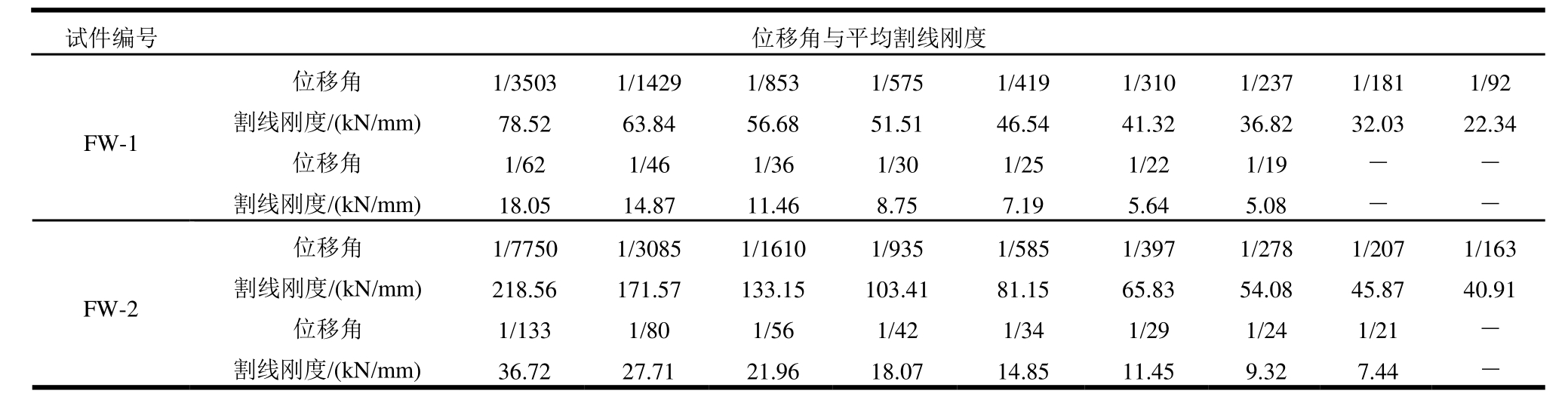 2) 随着水平位移增大,2个试件割线刚度逐渐降低,加载后期,试件FW-2的刚度退化速率略大于试件FW-1。