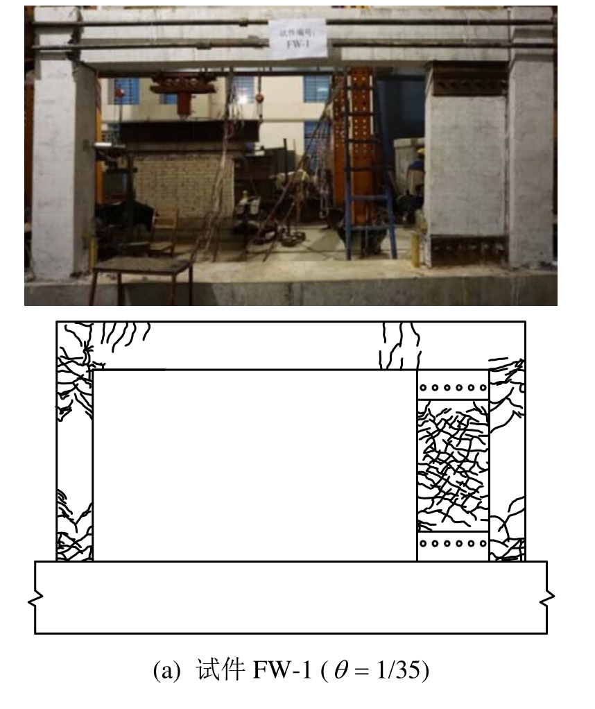 4) 加载至试件破坏。对于试件FW-1(图7(a)),RC框架右柱下端出现塑性铰,塑性铰长度300 mm,混凝土保护层剥落、局部压碎,纵筋压屈;右柱上端400 mm范围内出现斜裂缝,150 mm范围内形成塑性铰。RC框架左柱下端出现塑性铰,塑性铰长度 250 mm,混凝土保护层剥落、局部压碎,纵筋压屈,产生严重破坏;左柱上端150 mm范围内形成塑性铰。RC框架梁左端出现竖向裂缝,右端(耗能墙边缘)出现较宽的竖向裂缝。耗能墙出现较多细密斜裂缝,耗能墙与框架连接处出现明显滑移;耗能墙上端两侧产生约 45°的斜裂缝,斜裂缝水平投影长度约150 mm,系由梁传递剪力所致,如图7(c)所示。