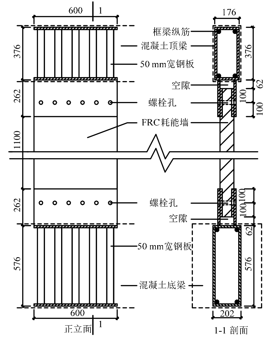 用HPFRC制作的耗能构件,其成本比钢耗能构件低很多;能提供比钢耗能构件更大的强度和刚度,尤其是能抵抗轴力,减小竖向构件(柱、墙)的轴压比;HPFRC耗能构件可以预制,再根据需要安装在结构的适当部位;不需要采用斜杆,直接采用柱或墙构件,与原结构竖向构件平行放置,便于空间利用;HPFRC耗能构件在结构主体施工结束后安装,仅承受水平荷载及水平荷载产生的轴力,其变形和耗能能力很好。鉴于HPFRC耗能构件的上述优点,本文将HPFRC耗能墙装配于RC框架结构中,形成RC框架-HPFRC耗能墙新型抗震结构,并对其进行拟静力试验,研究其破坏机理、变形和耗能性能等。