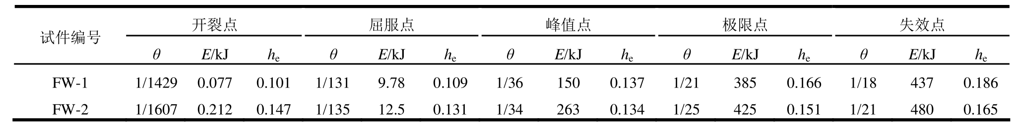 1) 2个试件的 E值均随试件侧移角增大而增大。试件FW-2与FW-1累积耗能值之比,对开裂点、屈服点、峰值点、极限点和失效点分别为2.75、1.28、1.75、1.10、1.10,表明从开裂到峰值荷载点,试件FW-2的累积耗能比试件FW-1多,此后则基本相同。