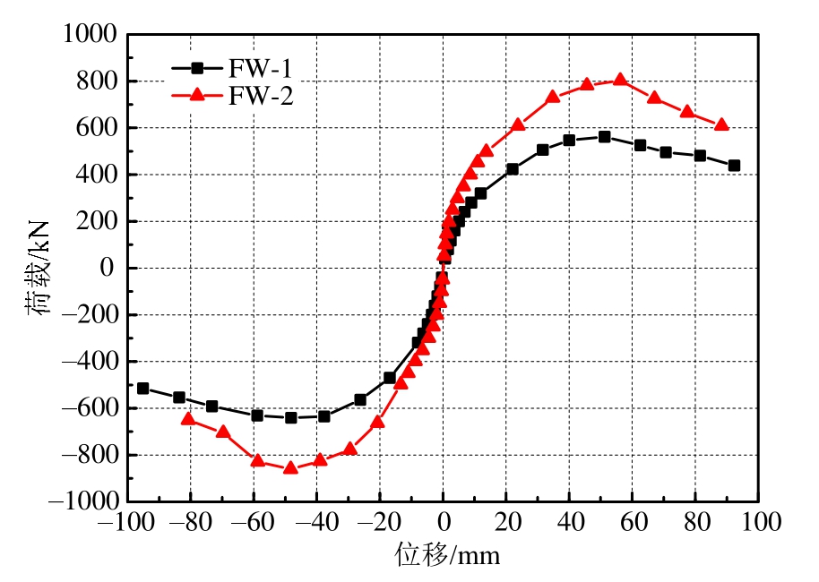 2) 在过峰值荷载点的 3级位移幅值下,试件FW-1的正、反向承载力退化系数平均值分别为0.96、0.90、0.86,试件FW-2的承载力退化系数平均值分别为0.93、0.82、0.76,可见试件FW-2的承载力退化较试件FW-1略快一些。