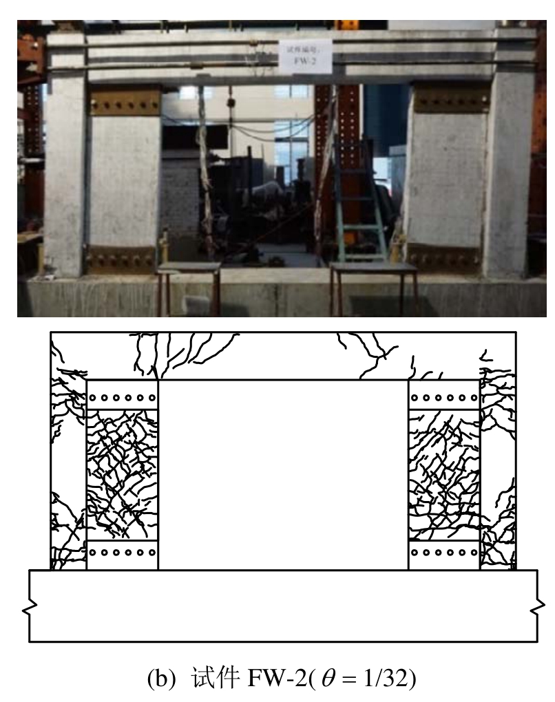 2) 加载至试件屈服。当试件FW-1的水平荷载达 到 +364.56 kN(θ=1/111)及 -378.06 kN(θ=1/161)、试件 FW-2的水平荷载达到+500.00 kN(θ=1/129)及-495.15 kN(θ=1/140)时,试件的顶点水平荷载-位移曲线明显偏离直线,同时框架柱的纵筋应力达到其屈服强度。此时框架梁、柱的裂缝数量增多,裂缝宽度增大;框架柱下端裂缝宽度较大;两个试件的耗能墙均未见明显可见裂缝。