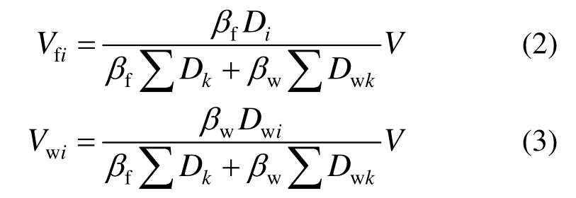 式中:Vfi、Vwi分别表示一根框架柱和一片耗能墙承受的水平荷载;V表示总水平荷载;Di、Dk分别表示第i根、第k根框架柱的弹性侧向刚度;Dwi、Dw k分别表示第i片、第k片耗能墙的弹性侧向刚度;βf、βw分别表示峰值荷载点时框架柱、耗能墙的有效割线刚度系数。