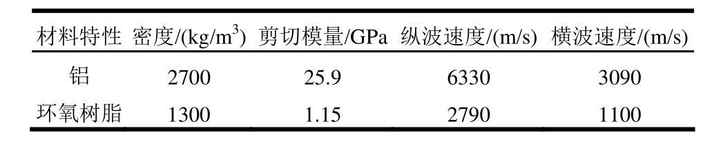 基于上述理论模型,利用MATLAB软件编写相应的程序研究粘接结构中垂直入射纵波的反射和透射特性。本文选取质地均匀的铝和环氧树脂分别作为粘接结构的基体材料和粘接剂,它们的材料参数见表1。
