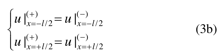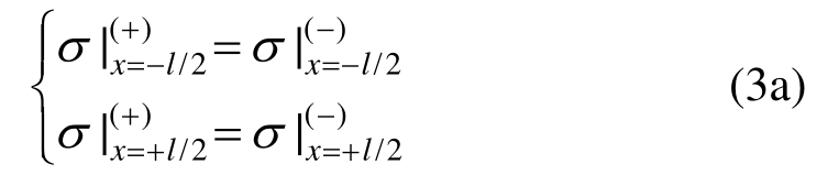 文献[28]对准静态模型的含义进行了较为详细的阐释,因此出于撰写简洁性考虑,这里不做过多的描述。在粘接结构的界面1和2(即x= ±l/2)上,位移u和应力的准静态模型关系可写为以下形式: