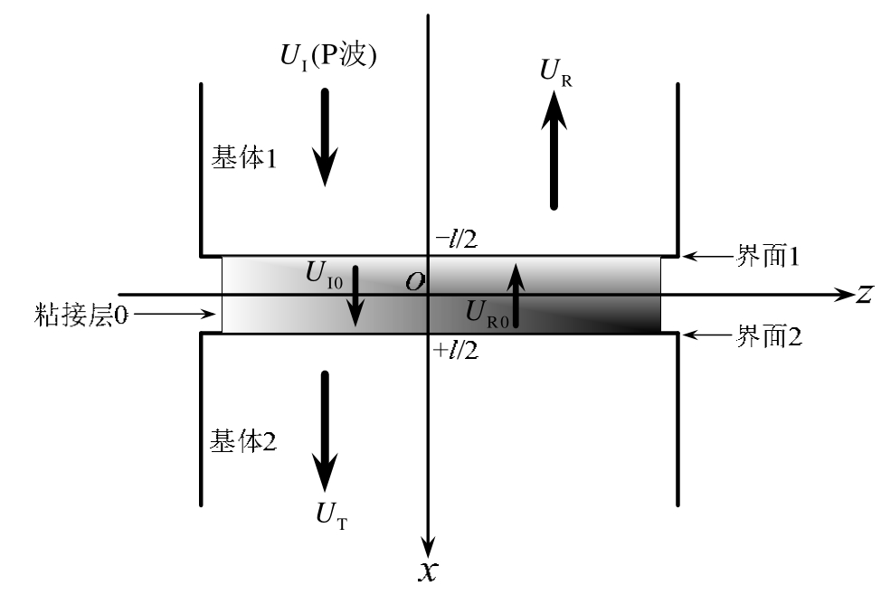 图1所示为三层板状粘接结构的几何模型[29]。半无限固体介质1和2分别为粘接结构的上、下基体,介质0是厚度为l的粘接层。将笛卡尔坐标系的z轴置于粘接层的中心平面,板厚沿x方向。图中UI、UR和UI0、UR0分别为基体1和粘接层中入射、反射纵波的位移势幅值;UT为基体2中透射纵波的位移势幅值。由于工业生产中所用到的粘接结构的上下基体大多为同种性质的材料,因此,本文的研究假定粘接结构的上下基体为同一介质。