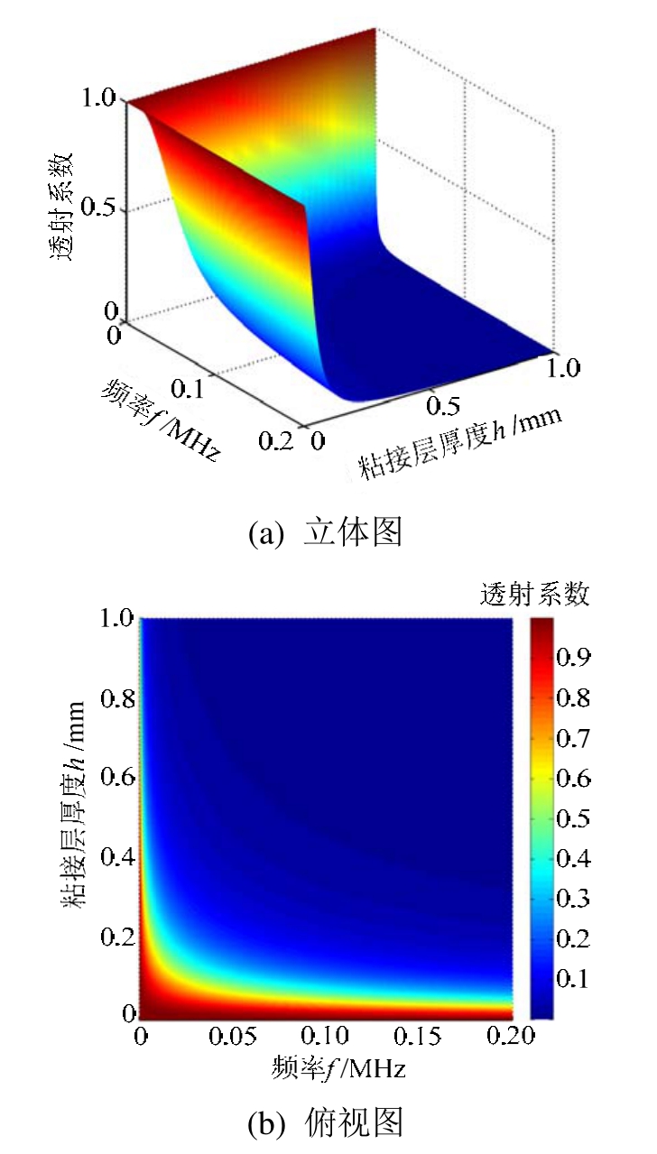 图5、图6分别为入射频率、粘接层厚度和纵波的反射、透射系数之间的三维关系。为了保证准静态模型计算的准确性,这里仍然将频厚积的取值范围固定在0~0.2 MHz·mm。图中颜色的深浅表示反射或透射系数幅值的大小。观察可知,随着频率和粘接层厚度的增加,纵波反射系数的幅值迅速增大,直至达到 1;纵波透射系数的幅值随着频率和粘接层厚度的增加快速下降至0。