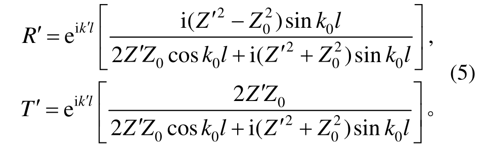 通常情况下,入射声波的振幅UI为已知量。这里假设纵波的振幅 UI=1,那么在x=±l/2处,将式(1)、式(2)、式(3)和等式k′ =ω/V′、k0=ω/V0相结合并经过一定的运算,最后可以得到纵波垂直入射三层板状粘接结构时的反射和透射系数表达式: