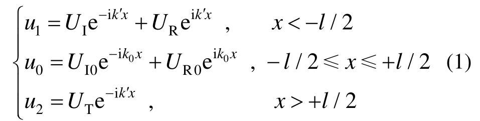 式(1)中:u1、u0和u2分别为基体1、粘接层和基体2中的质点位移;k′=ω/V′和k0=ω/V0分别为基体和粘接层中纵波的波数,这里V′和V0分别为基体和粘接层中纵波的声速;i为虚数。