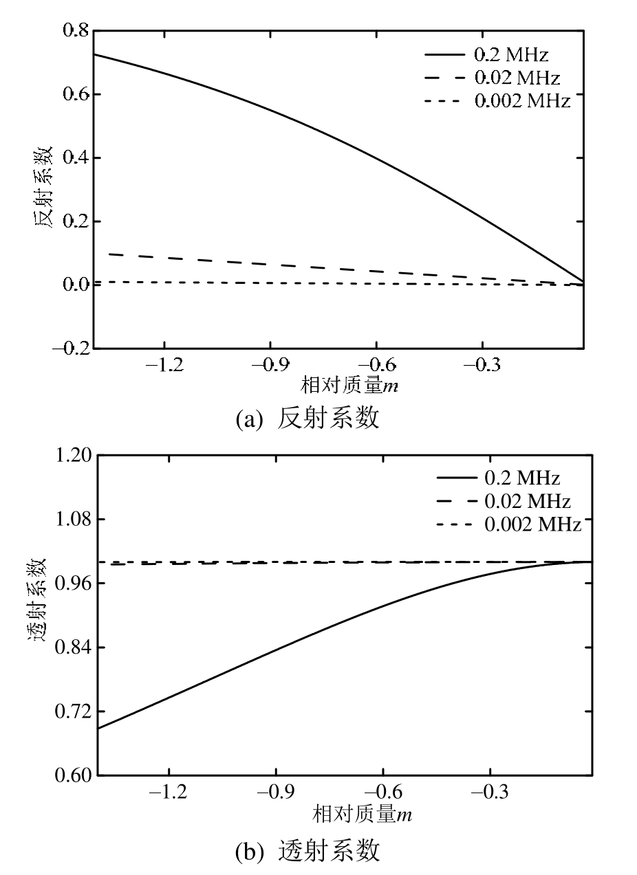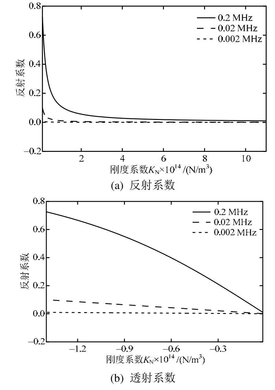 图3、图4分别讨论了刚度系数KN、界面相对质量m的变化对纵波反射和透射特性的影响。本节所选取纵波的入射频率分别为 0.2 MHz、0.02 MHz和0.002 MHz(诚然,频率也可取满足条件的其它值)。需要说明的是,这里令界面的法向刚度系数和相对质量分别在[1.12×1013N/m3, 1.12×1015N/m3]和[-1.4, -0.014]的区间范围内变化。这样选取使得频厚积fh的范围不会超过0.2 MHz·mm,进而也就保证了准静态模型的计算精度。