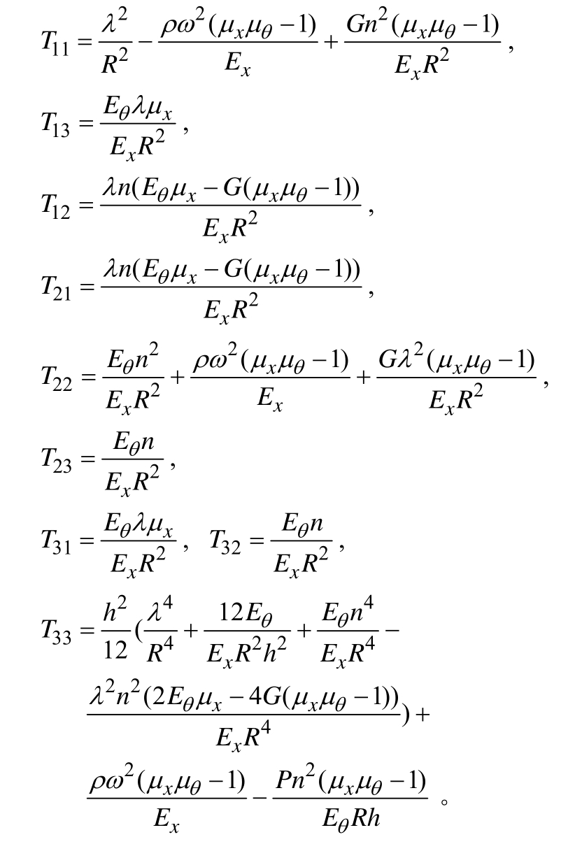 如式(19)所示,系数矩阵行列式是n、λ、ω等3个未知变量的函数,同时n、λ、ω等3个变量还需满足等式(14),因此求得式(14)与式(19)构成的方程组的解即可求得符合边界条件的圆柱壳固有频率等结果。