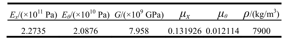 综合以上研究发现,有关文献中应用广泛的波传播方法忽略了圆柱壳轴向和周向振动的耦合效应,虽简单易行,但有时会产生较大计算误差[9]。多种改进位移函数的求解方法及直接解法等一些方法的适用范围广,但表达式较繁琐,且有关公式随条件变化需进行改变。有关两端弹性基础上正交各向异性圆柱壳自由振动的研究尚比较欠缺,弹性基础刚度和内压力等因素的变化对正交各向异性圆柱壳固有频率影响规律的研究还不够充分。
