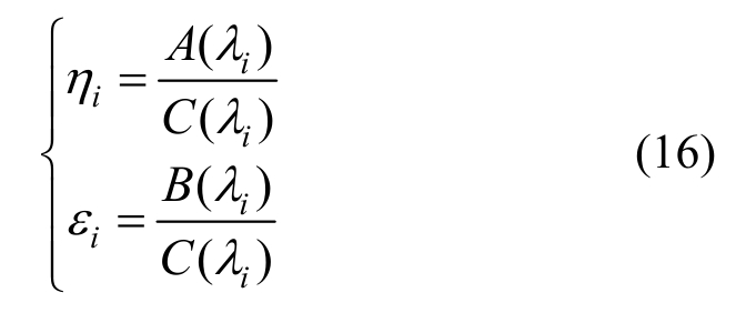 得到特征方程式(14)的根值,代入方程组式(13),求得相应的振幅比系数iη和iε表达式:
