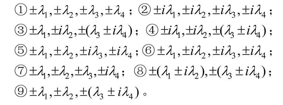 随着圆柱壳参数值等多种因素的变化,特征方程式(14)所对应的8个根的形式将随之变化,不同形式的根组合构成不同的一组解,共计存在9组不同的解。不应简单假定方程的解为一组特定形式根值的组合,如常用的1对纯实根、1对纯虚根和2对复根的组合,或有些文献中所提到的8种组合形式[25],否则可能会出现漏解等问题。式(14)的可能解共包括如下9组: