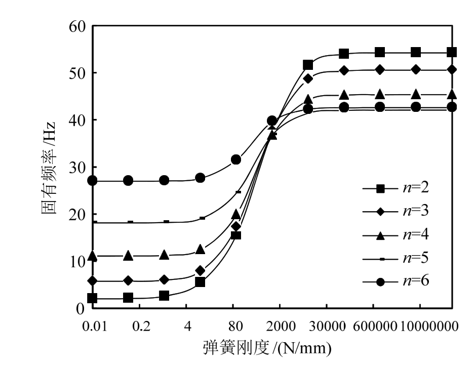 图3所示为轴向支撑弹簧刚度对圆柱壳固有频率的影响,图4所示为径向支撑弹簧刚度对圆柱壳固有频率的影响。