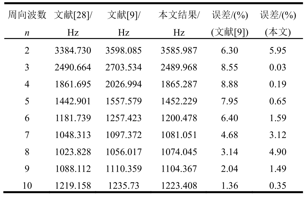 文献[16]采用 Flügge经典薄壳理论,文献[27]中使用了含有横向剪切应变的应变-位移表达式,并沿用Novozhilov壳体理论计算得到表中结果。表中的最大误差项是指本文计算结果与两组文献中结果比较时所得误差的最大值。结合表中的误差值不难看出,本文方法计算所得结果与两组文献中的计算结果相比,总体上误差很小,计算精度较高。