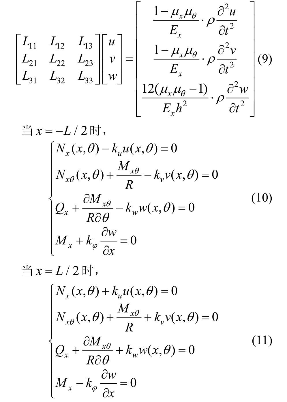 整理上述表达式,并令fu、fv、fw均为0,得到振动微分方程式(9)和对应的边界条件表达式(10)、式(11):