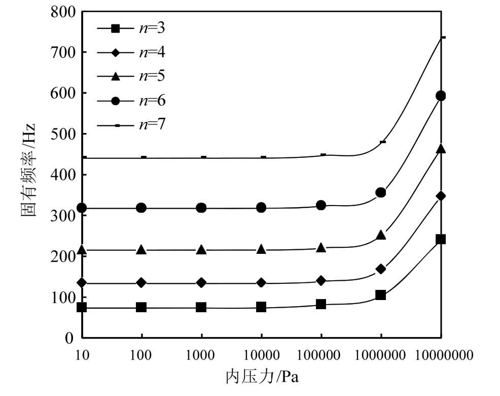 从图5可以看出,薄壁圆柱壳内压力会使得其固有频率增大,但内压力较小的时候,固有频率变化并不显著;但随着内压力的逐渐增大,圆柱壳固有频率会在预压力的作用下产生显著变化,迅速增加。这主要是由于内压力的升高增大了圆柱壳的刚度,进而影响圆柱壳的固有频率。内压力较小的时候,对圆柱壳刚度的影响不显著,因此对固有频率的影响不显著,而当内压力导致的刚度变化逐渐增大接近圆柱壳自身刚度时,对频率的影响便开始变得显著。若不考虑圆柱壳结构的失效,圆柱壳的刚度会随着内压力的增大而不断增大,相应的,固有频率也将不断增大。