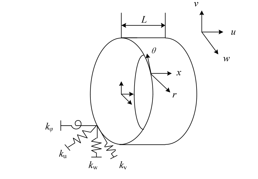 为便于建模研究,可对轮胎等实际工程部件进行抽象,简化为如图1所示的结构,即在两端弹簧支撑边界条件下的薄壁圆柱壳。