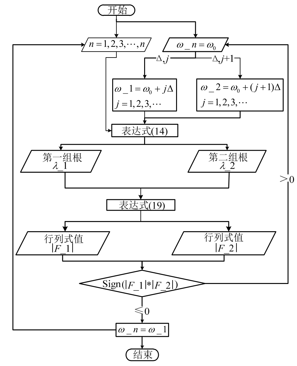 图2中,0ω是计算时给定的初始固有圆频率值,Δ为计算时采用的搜索步长值,ω_n即为对应的n阶固有频率。基于上述计算方法,可求得圆柱壳任意阶次固有频率及其模态振型。本文中的求解方法,完整覆盖了特征方程所对应的所有可能形式根值,可用于计算不同规格和边界条件下的正交各向异性薄壁圆柱壳固有振动特性及其变化,且不必像有些文献中那样需要针对对称和反对称振型 2种情况分别计算[26]。由于求解方法没有在Donnell-Mushtari圆柱壳理论基础上再做简化,因此所得结果是基于本文理论所能得到的精确计算结果,具体计算精度取决于流程图中的搜索步长值Δ。