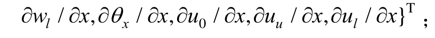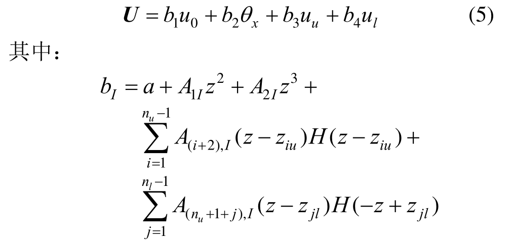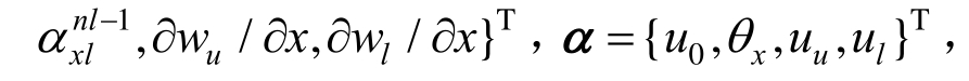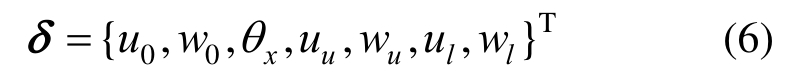 其中:u0代表夹层结构的中面;θx是夹层结构中面法线关于z轴的转角;nu、nl分别为中面以上夹层层数和中面以下的夹层层数;βx、ηx为未知高阶常数;![]()