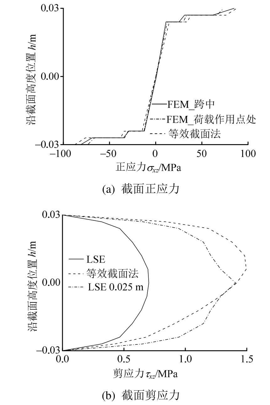 表5给出了木质芯材夹层板在20 kN荷载作用下以及泡沫芯材在3 kN荷载作用下,分别由试验、有限元和等效截面方法计算的构件受拉区最大正应力和芯材中和轴处最大剪应力值的比较。其中“加载点附近”指由有限元法计算的中和轴处具有最大剪应力的截面。图6以P48-Z3-G3试件为例给出了截面沿轴向正应力和剪应力分布图,其中图6(a)为有限元跨中、分配梁加载点处及等效截面法求得的跨中加载点处的受拉应力分布;图6(b)为有限元分配梁加载点及加载点附近截面,以及等效截面求得的中和轴最大剪应力。由于数值方法本身精度误差问题,因此有限元截面剪应力计算过程中采用前文所述的最小二乘法。
